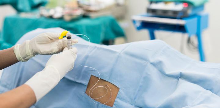 A anestesia é aplicada entre a 3ª e a 4ª vertebra da coluna lombar através de uma agulha no espaço chamado peridural e inserido um cateter, por onde a medicação pode ser injetada de forma continua ou periódica.